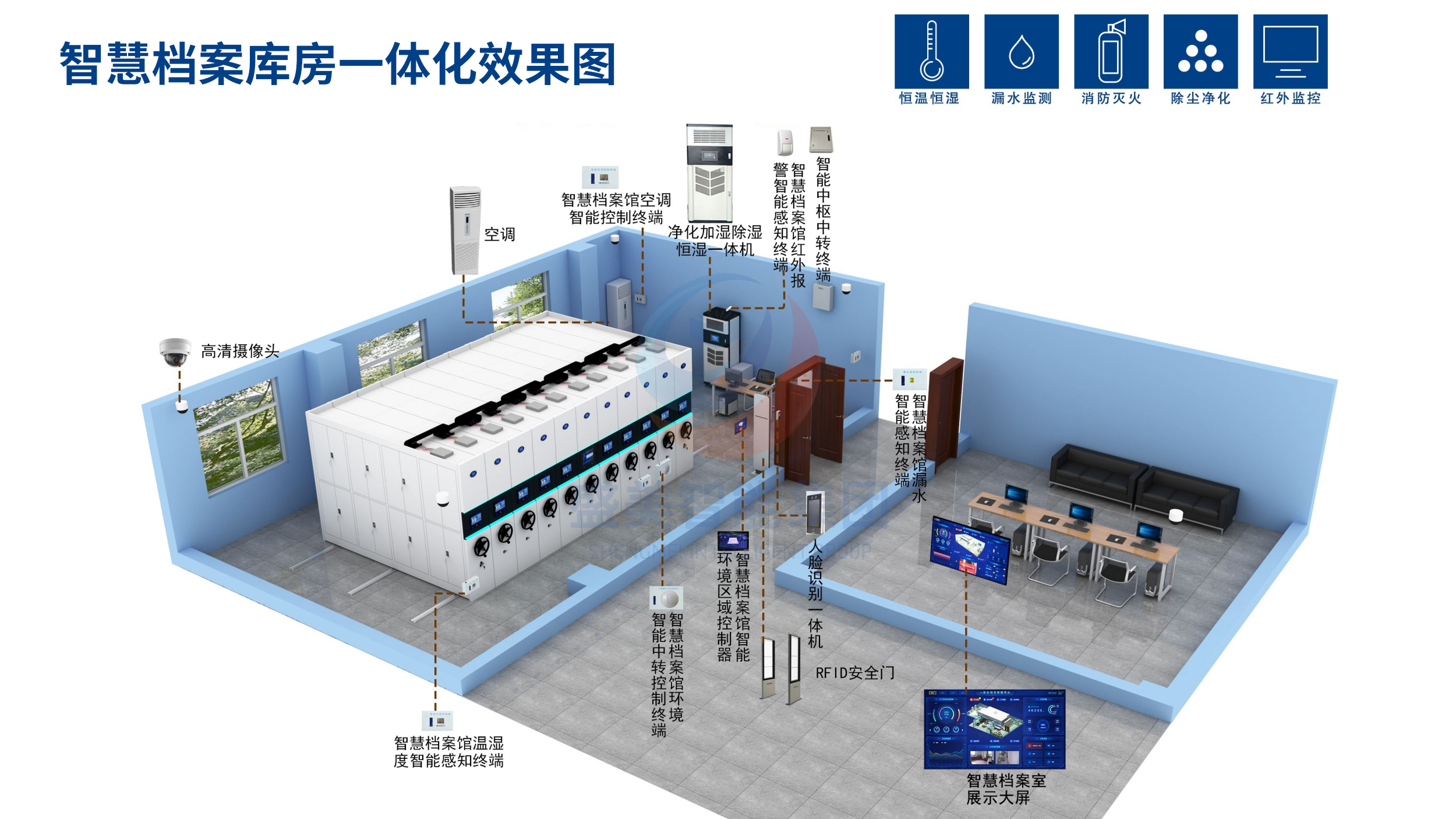 主营:智能密集柜,智能化一体档案室,数字化档案库房,档案室环境监控系统