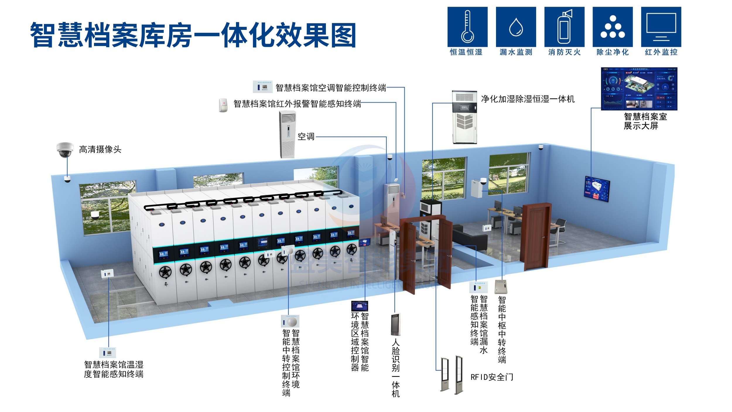 主营:智能密集柜,智能化一体档案室,数字化档案库房,档案室环境监控系统