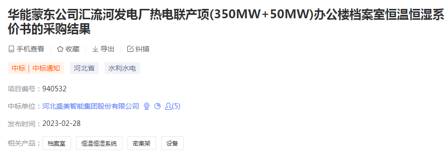 喜贺华能蒙东公司恒温恒湿系统及密集架设备项目中标!