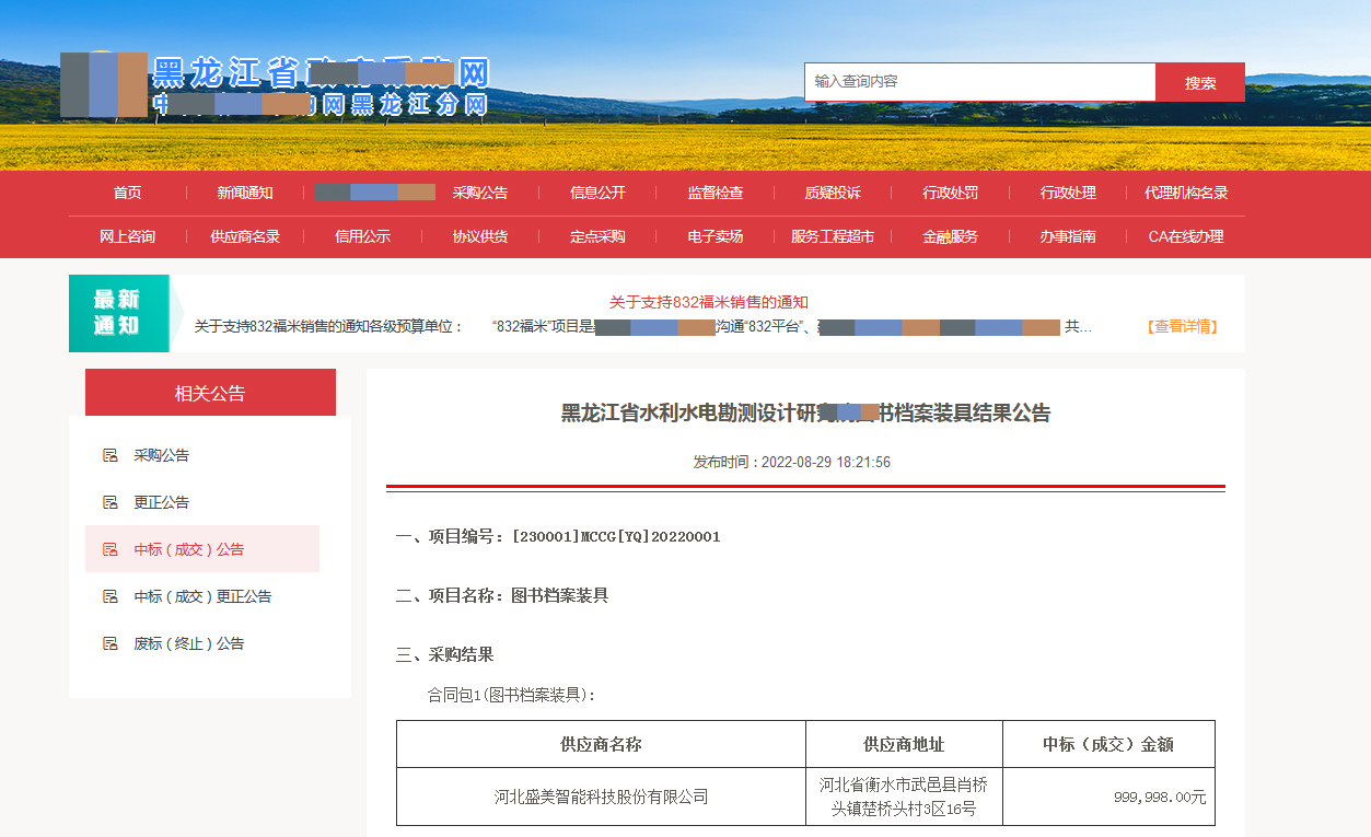 喜贺黑龙江某院图书档案装具采购项目99.9998万中标!非常感谢贵企业对于我司的信赖支持预祝此次合作圆满成功!